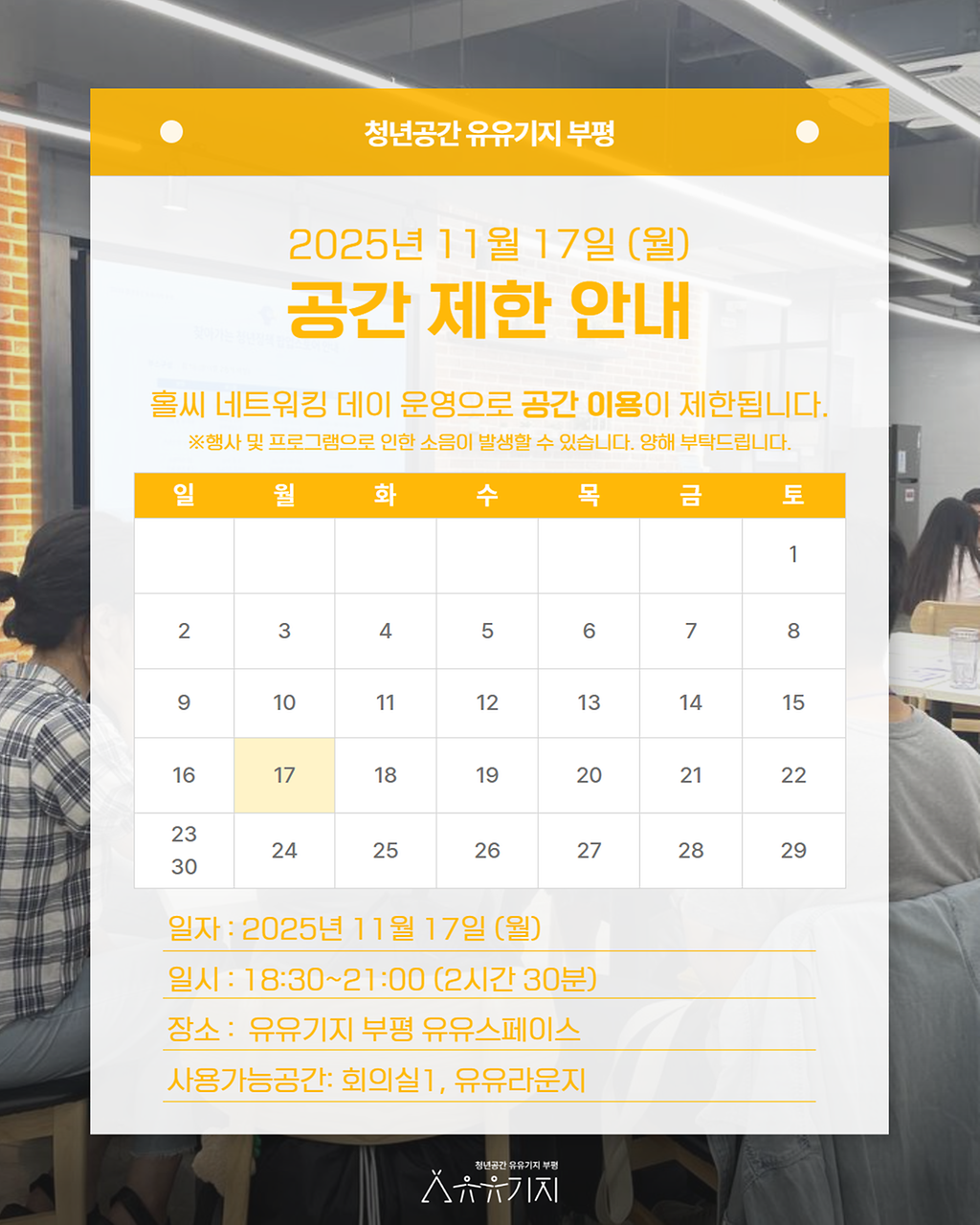 안녕하세요, 유유기지 부평입니다. 11월 17일(월) 공간 제한 안내드립니다.