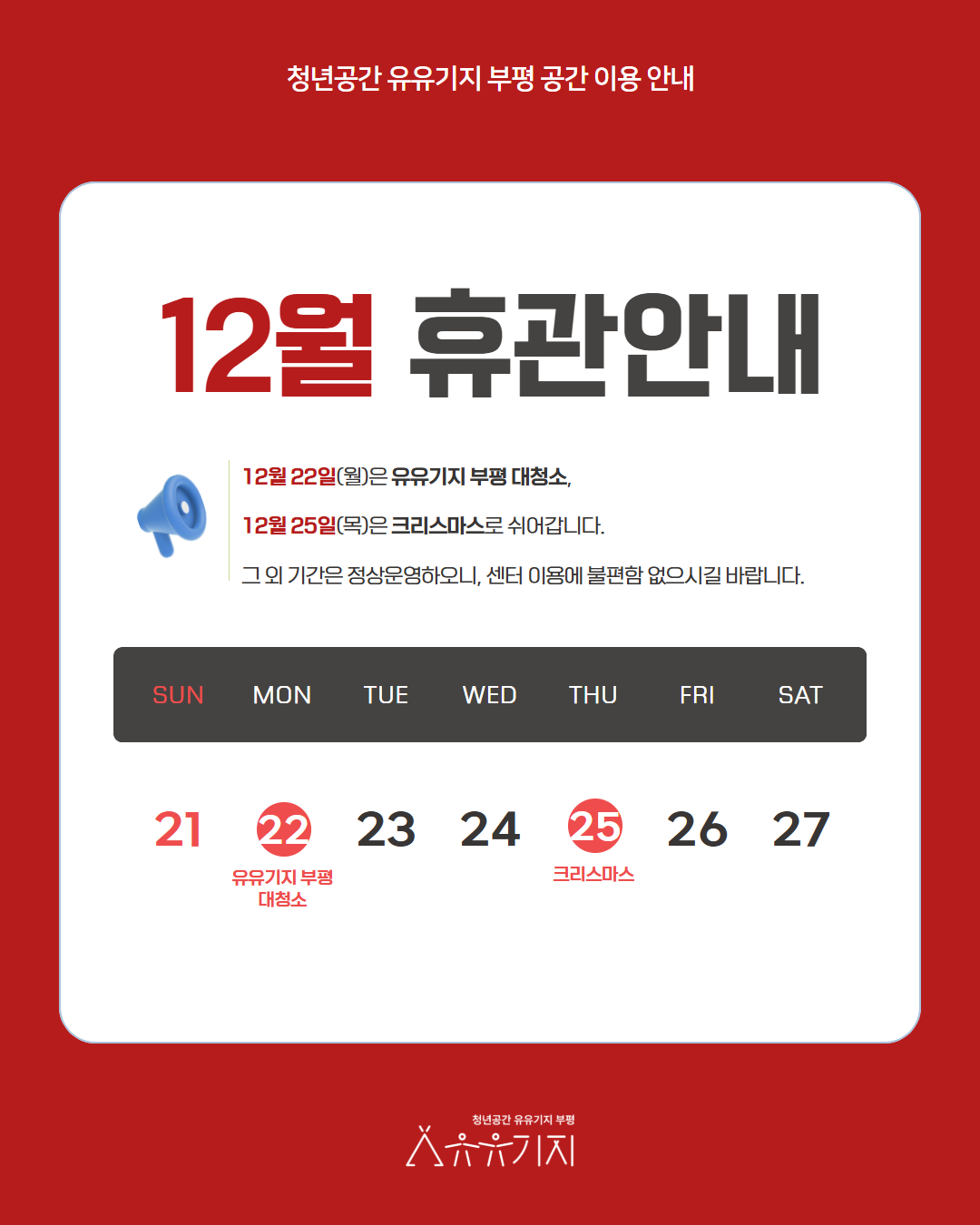 12월 22일(월)은 유유기지 부평 대청소, 12월 25일(목)은 크리스마스로 쉬어갑니다.