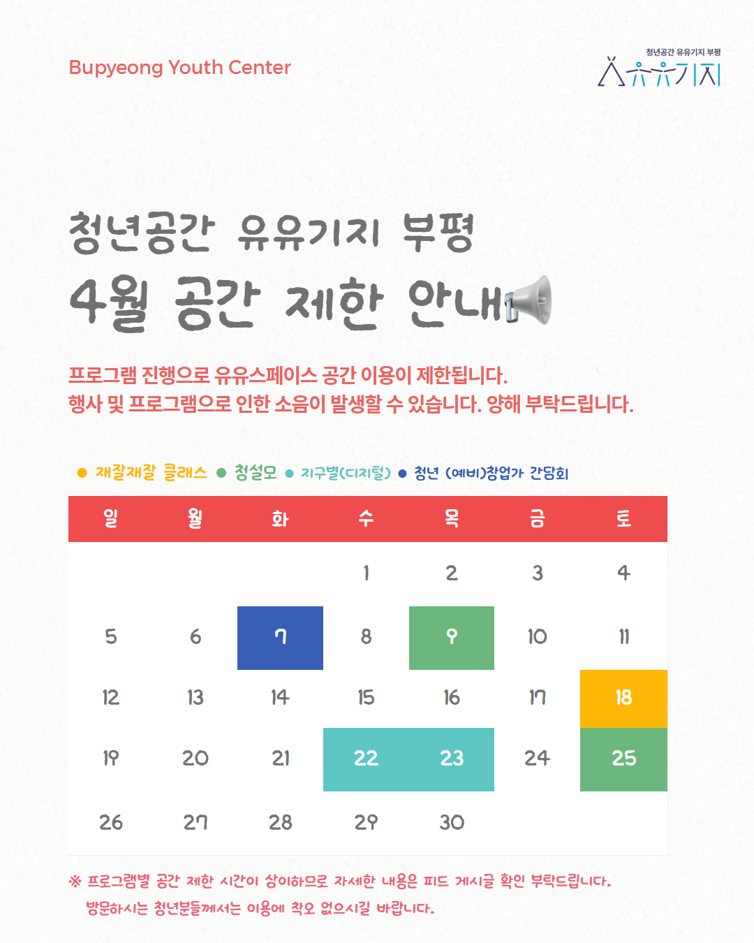 청년공간 유유기지 부평 4월 공간제한 안내