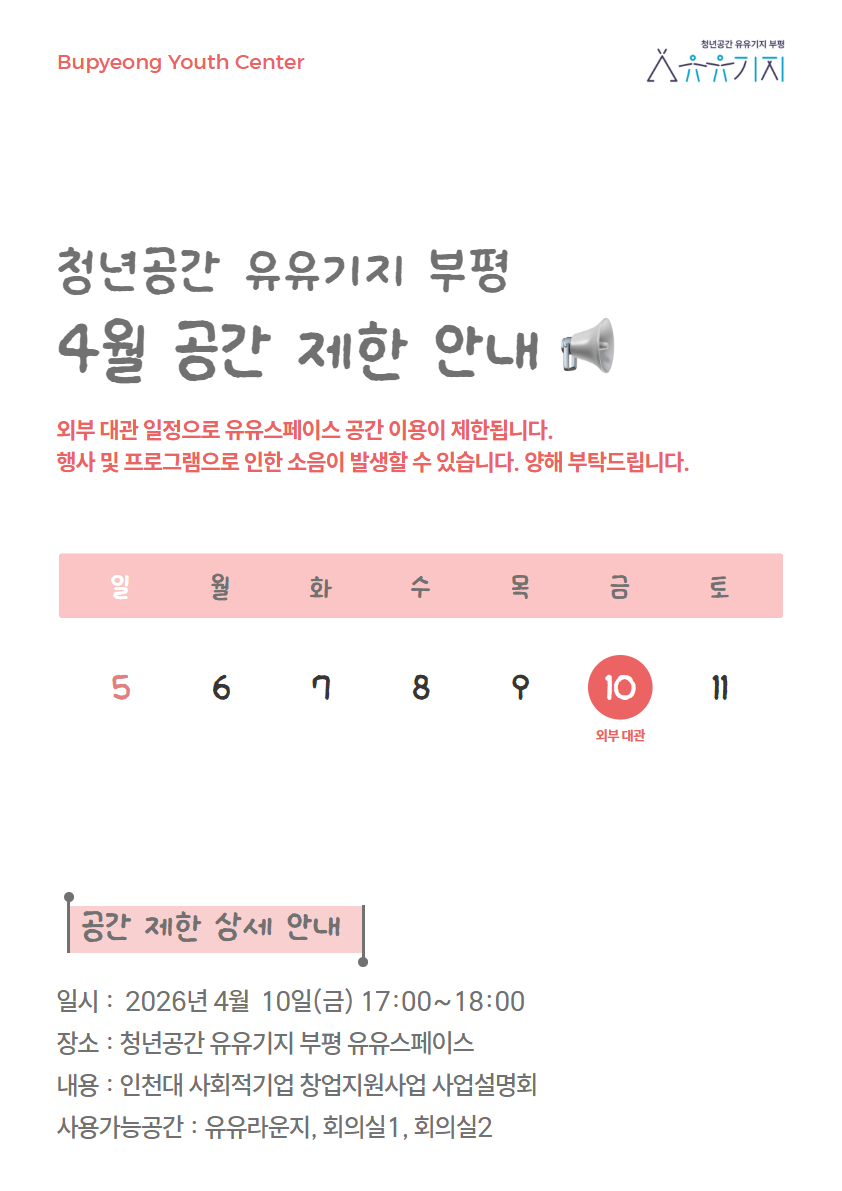 외부 대관 일정으로 4월 10일(금) 공간 제한 안내드립니다.