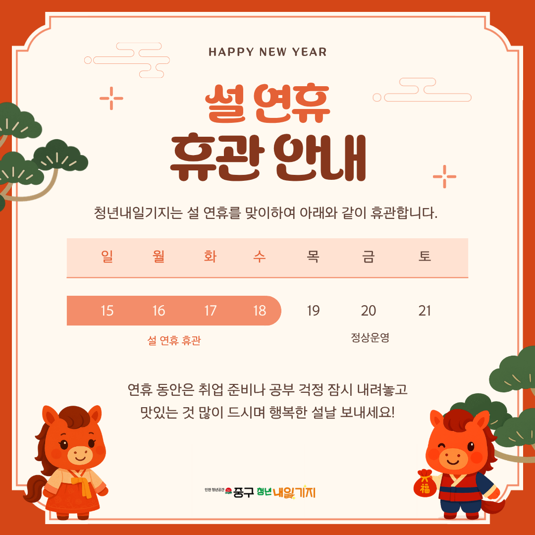 안녕하세요, 인천 중구 청년내일기지입니다. 청년내일기지는 설 연휴(2026.02.15(일)~02.18(수)) 휴관합니다. 청년내일기지를 이용하시는 청년분들은 참고하시어 이용에 불편 없으시길 바랍니다. 행복하고 즐거운 연휴 보내세요!