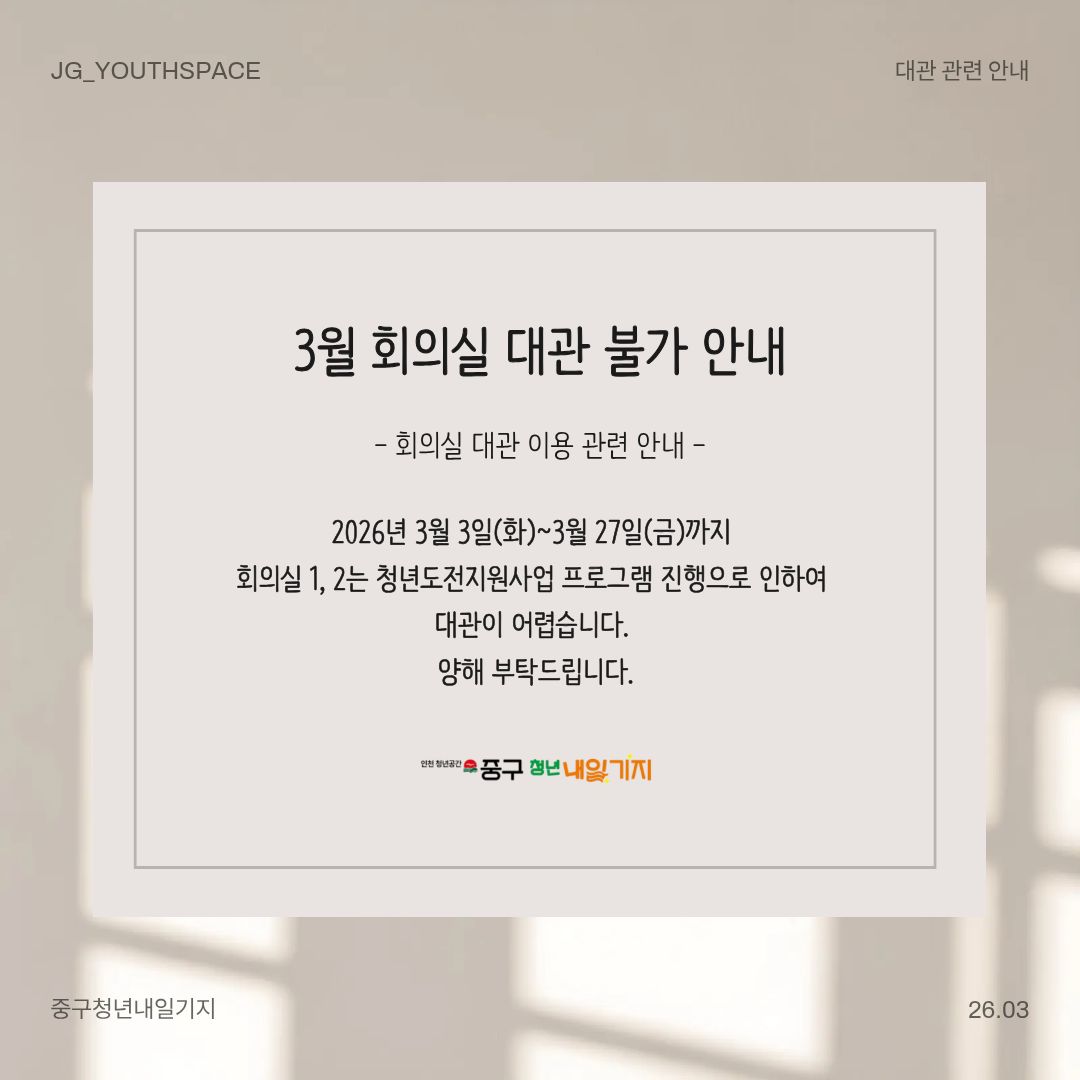 2026년 3월 3일(화)부터 3월 27일(금)까지 청년도전지원사업 프로그램 진행으로 인하여