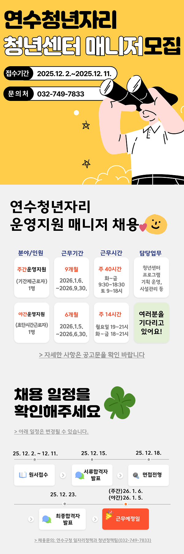 연수청년자리에서 청년센터 운영지원 매니저(기간제 근로자 등)를 채용합니다. 자세한 사항은 연수구청 홈페이지>참여알림>알림광장>채용공고에서 확인바랍니다.