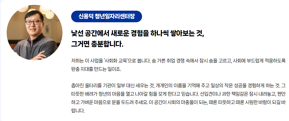“취업단념청년들이 다시 한번 도전할 힘과 용기를 얻었다는 점에서 의미 있습니다. 앞으로도 현장의 수요를 꾸준히 발굴해 사회와 청년을 연결하고, 청년들의 회복과 성장의 여정을 함께하는 기관이 되도록 노력하겠습니다.”