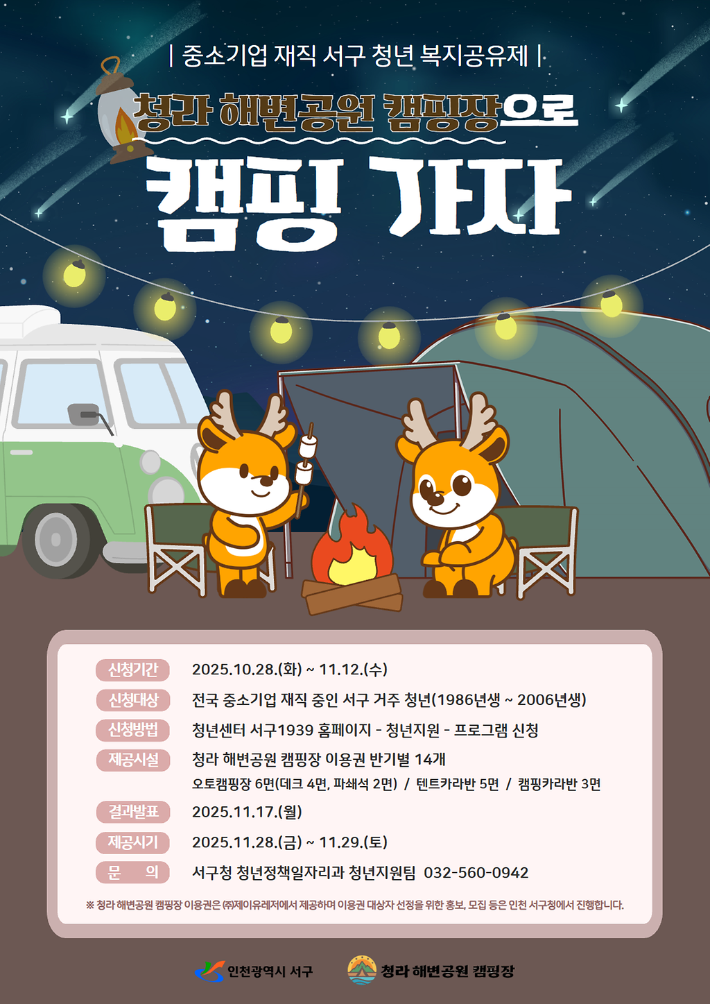 인천 서구청은 ㈜제이유레저와 함께 중소기업에 재직 중인 서구청년에게 11월 28일에 사용가능한 청라 해변공원 캠핑장 이용권 14개를 아래와 같이 추첨을 통하여 제공하고자 합니다. 휴식과 힐링이 필요한 청년의 많은 관심과 참여를 바랍니다.