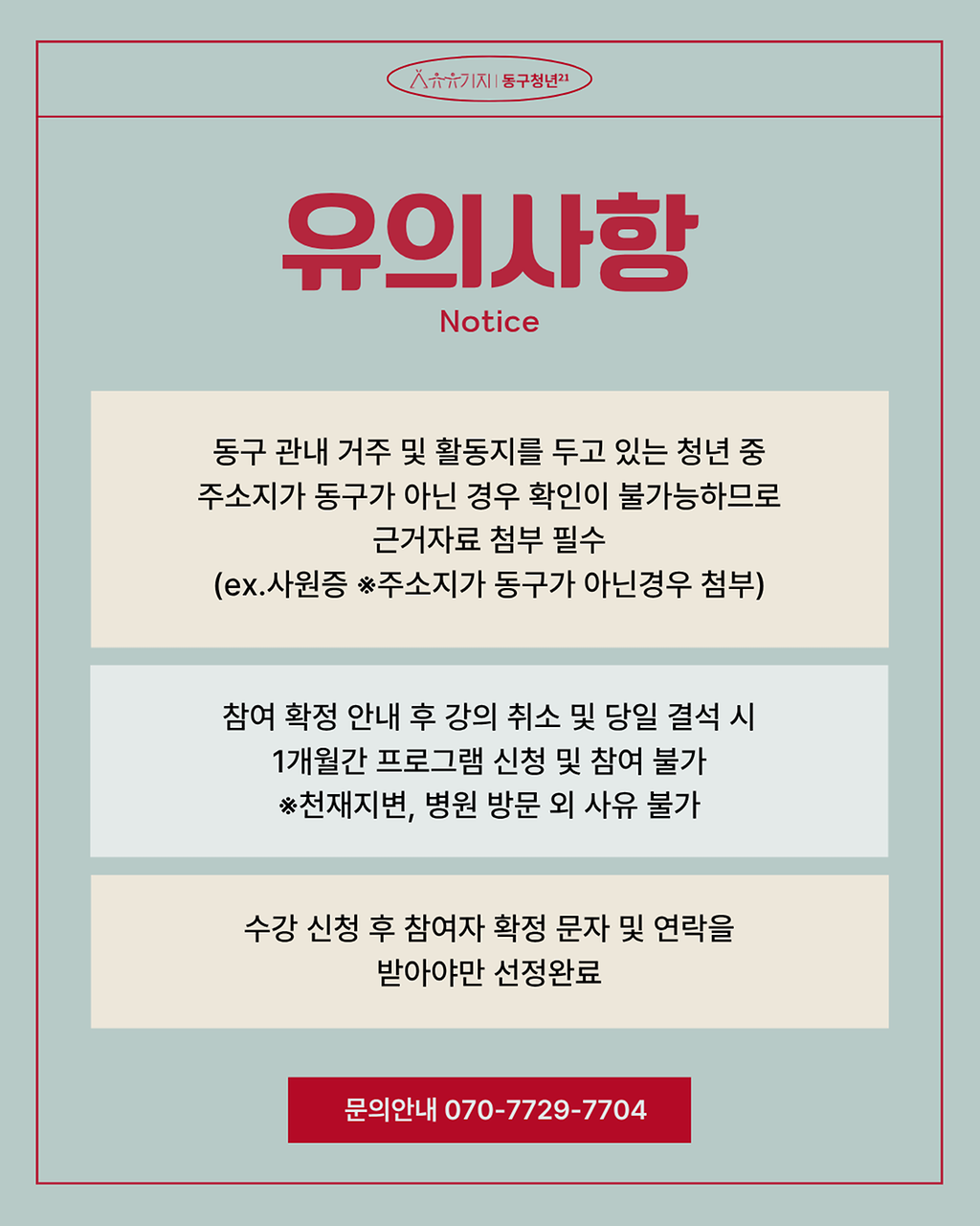 ※ 동구 관내 거주 및 활동지를 두고 있는 청년 중 주소지가 동구가 아닌 경우, 근거자료를 첨부해 주셔야 선정확률이 올라갑니다.(ex. 사원증, 학생증, 활동처 등)