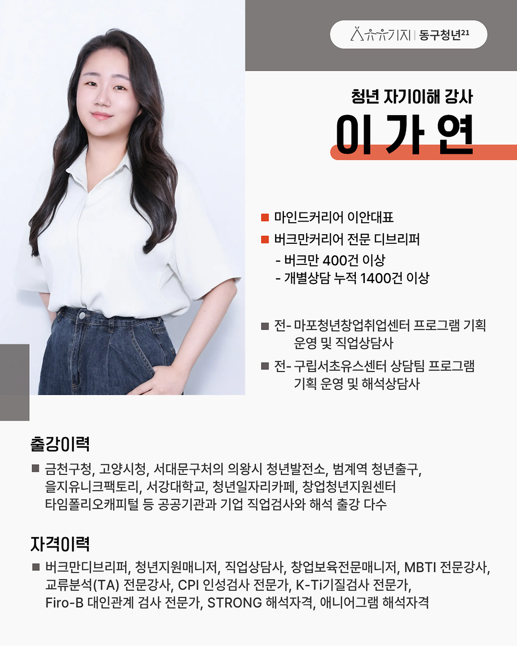- 전: 마포청년창업취업센터 프로그램 기획 운영 및 직업상담사