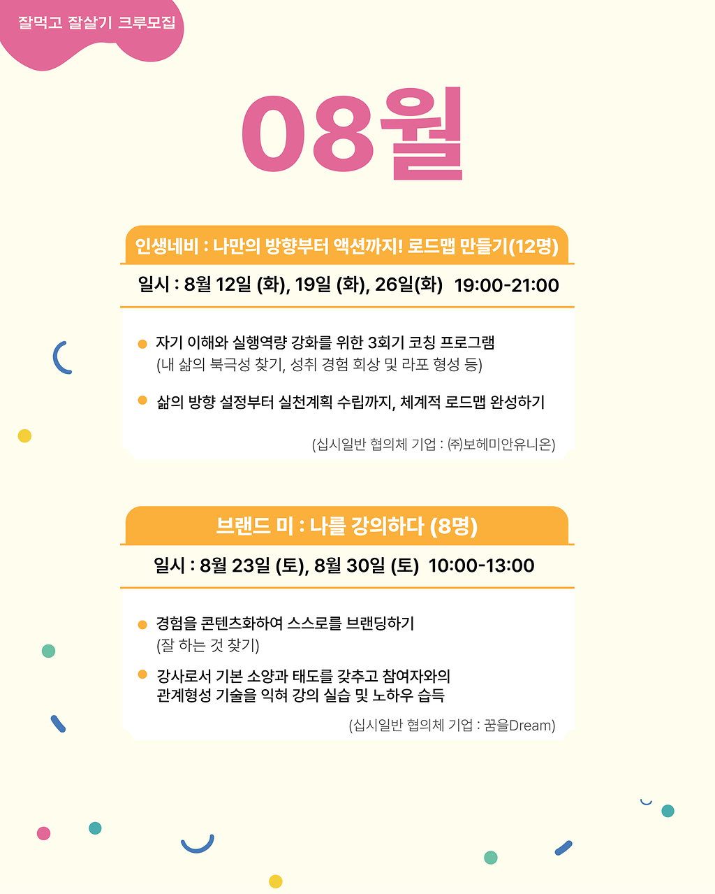 인생네비 : 나만의 방향부터 액션까지! 로드맵 만들기(12명) 일시 : 8/12(화), 8/19(화), 8/26(화) 19:00~21:00 |