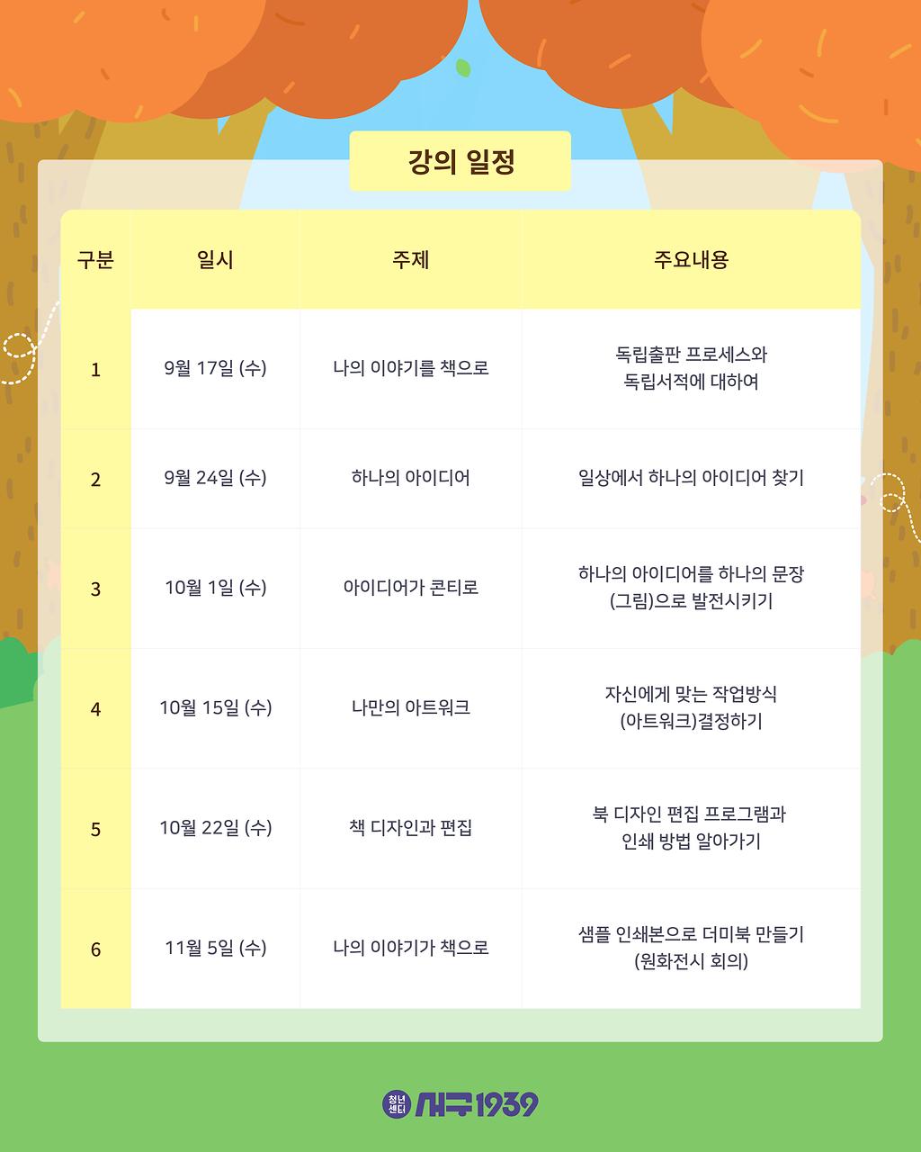 9월 17일 ~ 11월 5일 매주 수요일