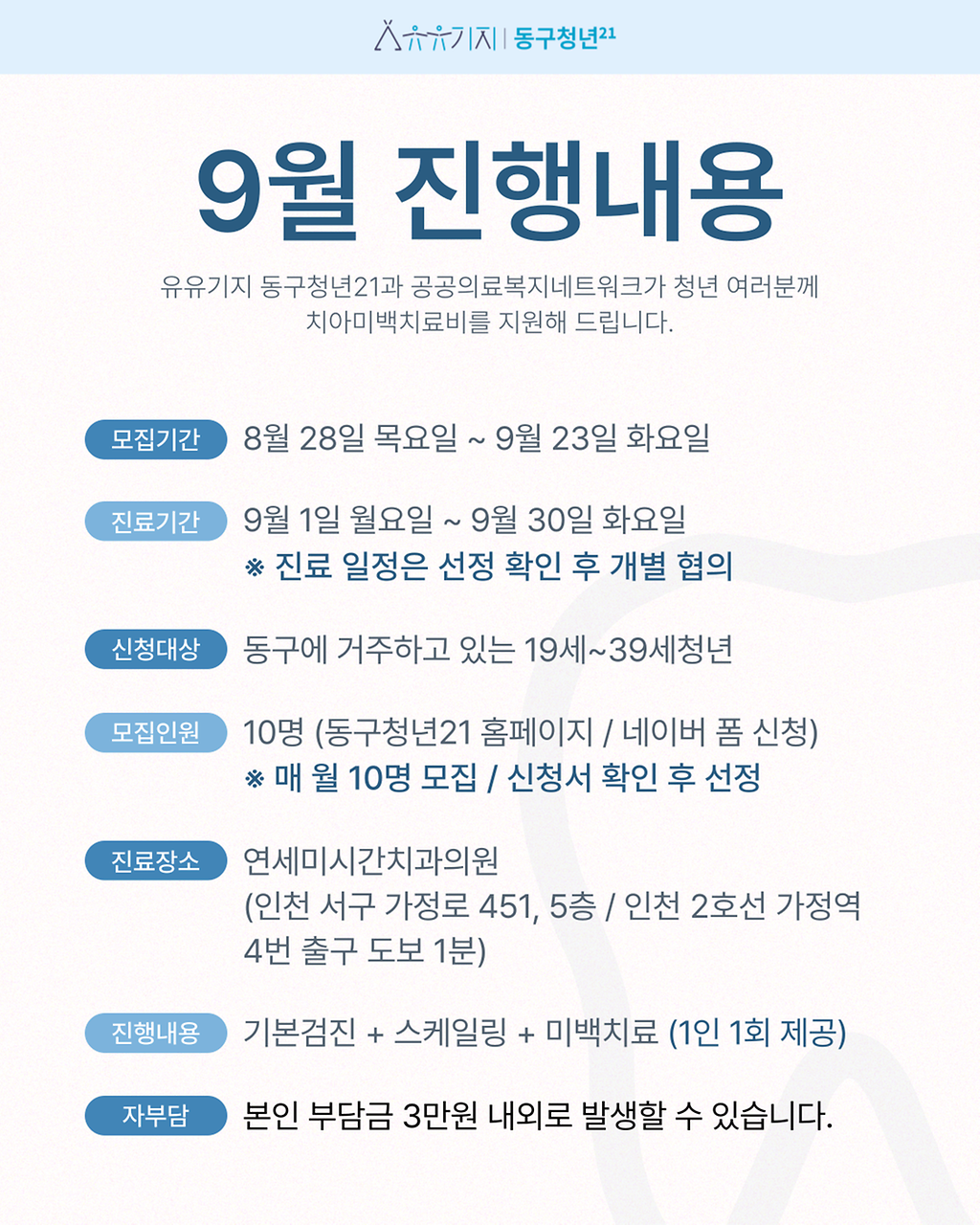 ▶ 9월 진료기간: 9월 1일(월) ~ 9월 30일(화)까지 (진료 일정은 선정 확정 후 개별 협의)