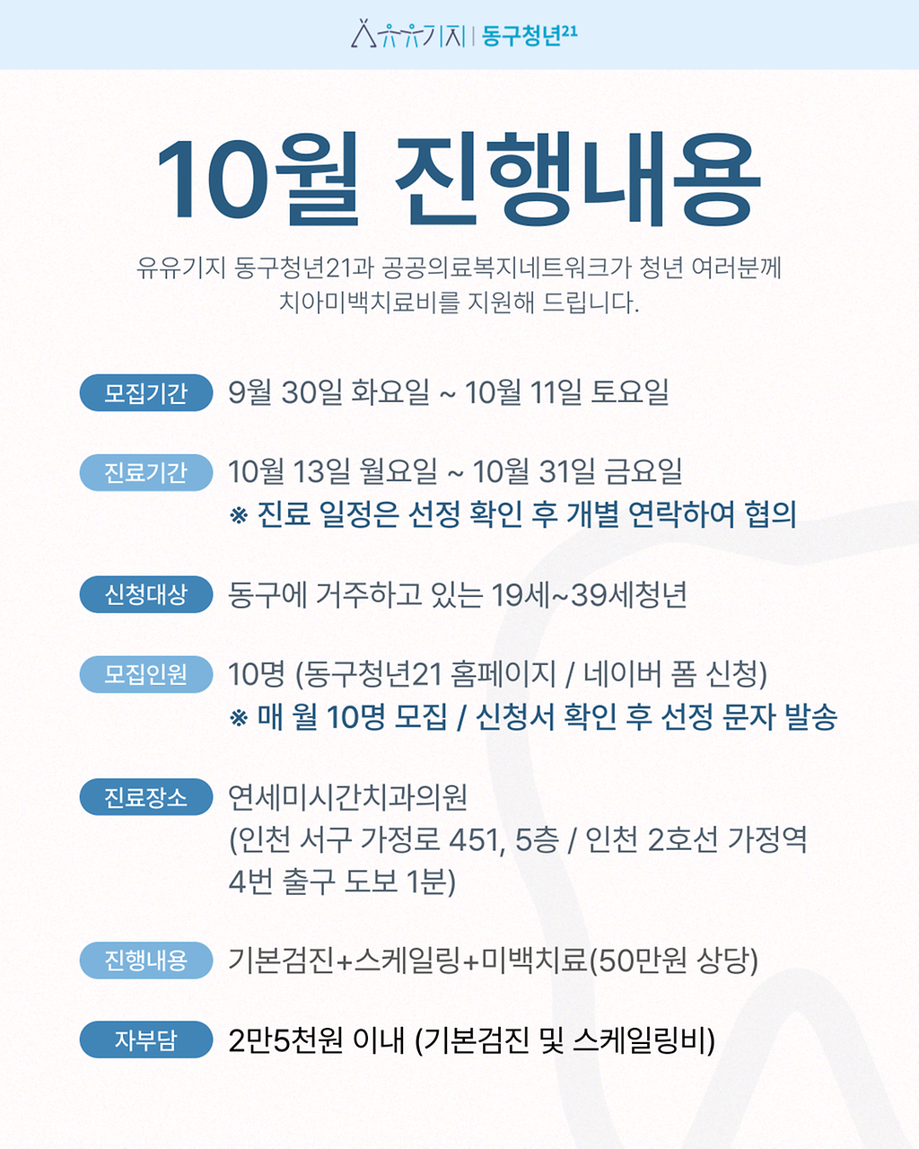 청년여러분께 치아미백치료비를 지원해드립니다.