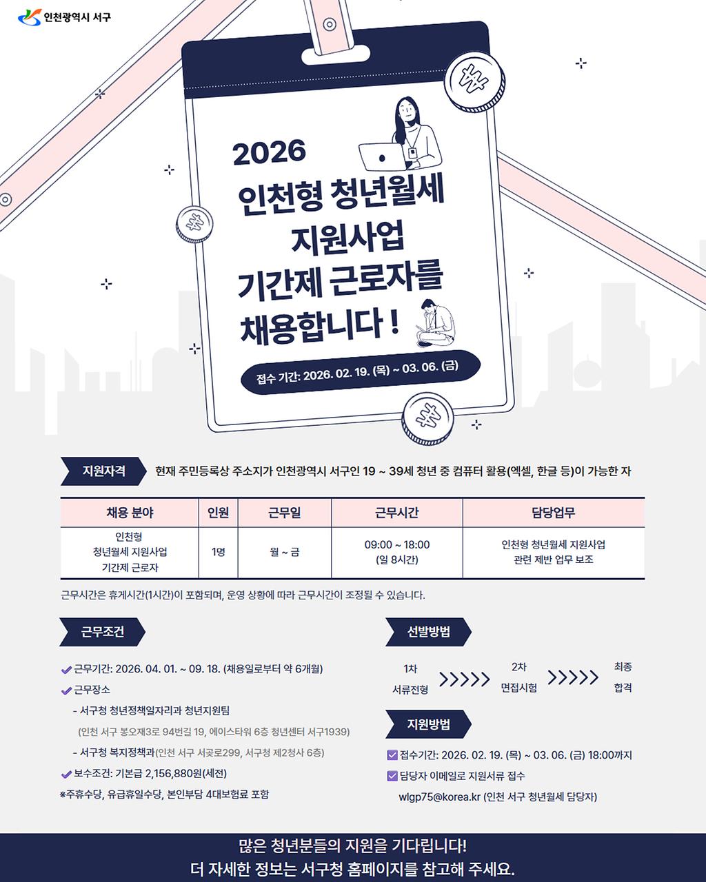 2026 인천형 청년월세 지원사업 기간제 근로자를 채용합니다.