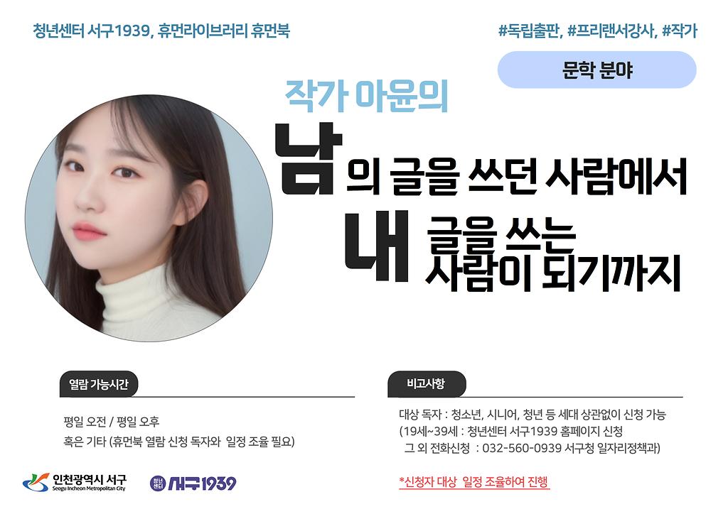 ![[휴먼라이브러리]작가 아윤의 남의 글을 쓰던 사람에서 내 글을 쓰는 사람이 되기까지](/images/program/1080_hyumeanraibuleari_cadeunyooseu_1%282%29.jpg)