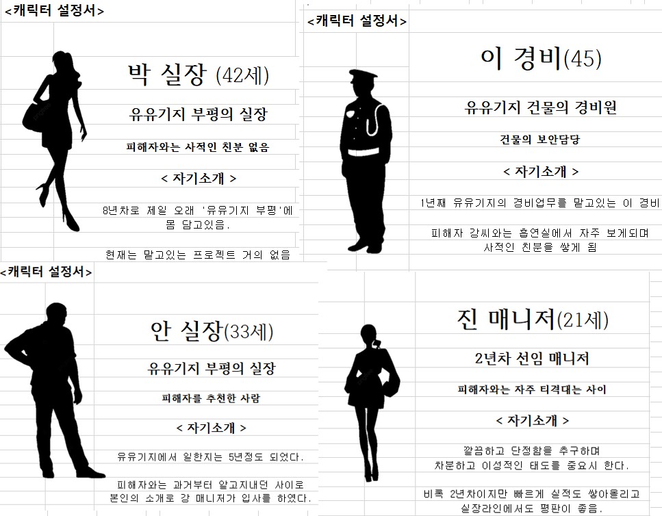캐릭터는 총 4명으로 구성했고, 각자 이름, 직업, 성격, 사건 당일의 행적, 그리고 감춰진 비밀까지 세세하게 설정했어요.