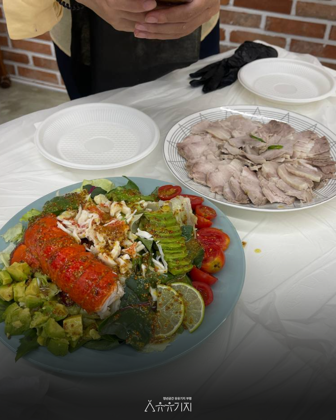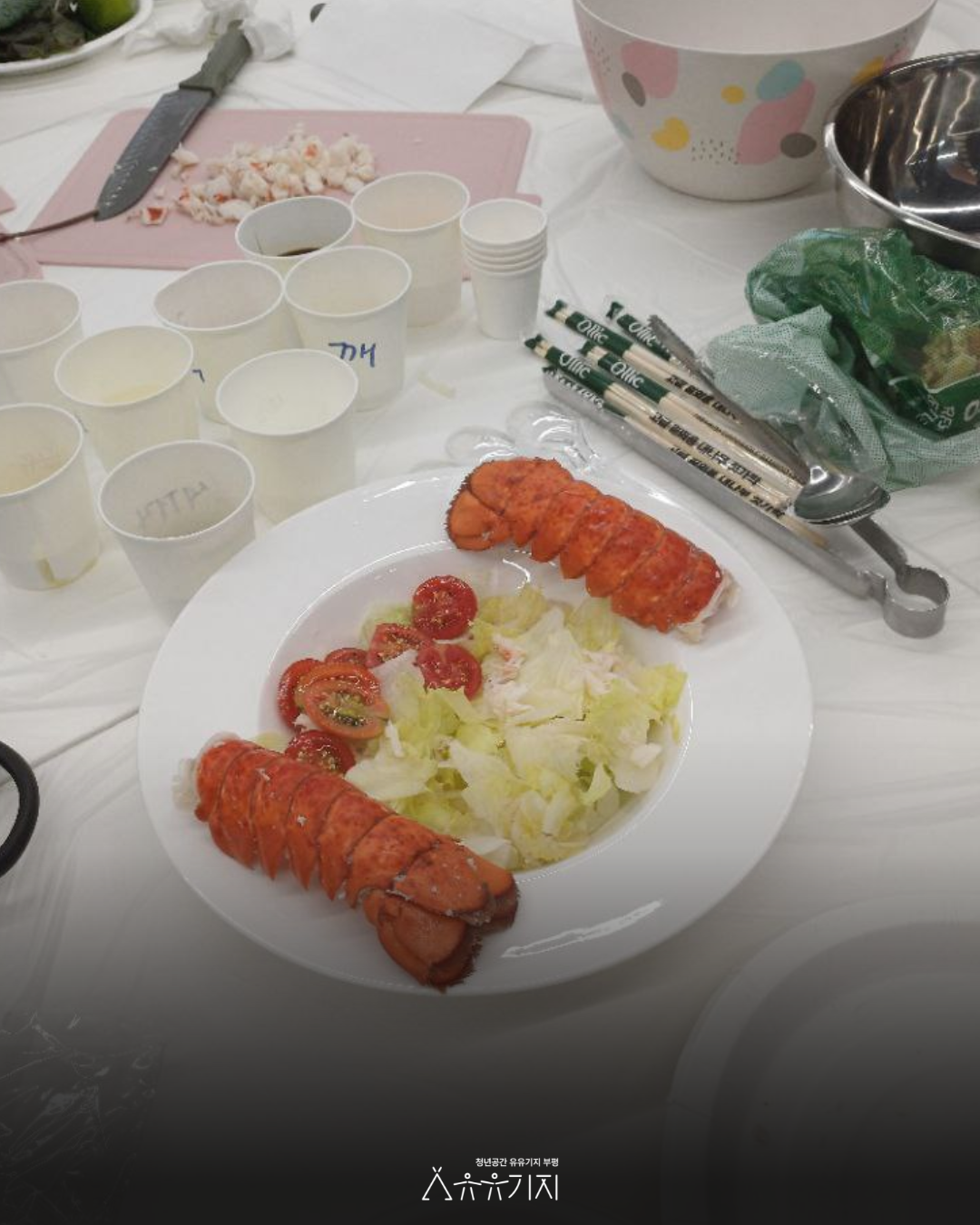 이번 강의는 ‘집에서 즐기는 간단한 요리 심화’를 주제로, 냉제육과 랍스타테일 샐러드 만들기를 직접 경험했어요. 강사님의 시연을 본 후 4인 1조로 나누어 실습을 진행했는데요. 냉제육에 어울리는 양념장과 랍스타테일 손질법을 배우고, 각자의 개성을 담아 플레이팅까지 멋지게 완성했답니다.