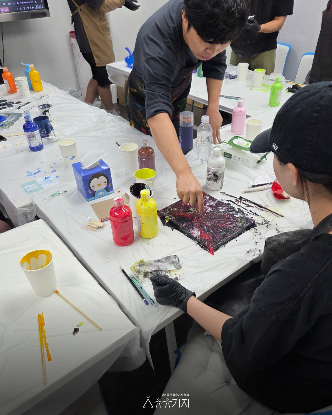 우연히 섞여 만들어지는 색감과 무늬는 참여한 청년들 각자의 감성이 고스란히 담겨, 창의력이 반짝이는 순간이었습니다. 🌈