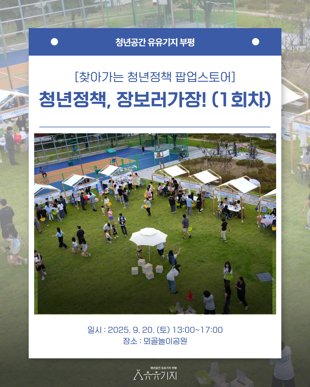 지난 9월 20일(토), 인천 부평구 뫼골놀이공원에서 청년공간 유유기지 부평에서 기획한 행사인 ‘찾아가는 청년정책 팝업스토어’ 1회차가 열렸습니다.