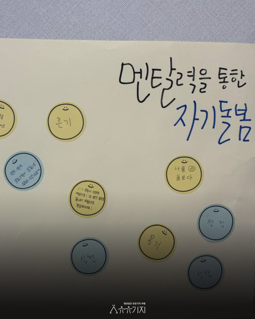 이어서 '자기돌봄을 통한 새로운 발걸음' 활동을 진행했습니다. 멘탈 리셋을 위한 '마음 챙김' 활동을 배우고, 그룹 토의를 통해 '하루 5분 멘탈 돌봄 실천법', '자기개발 계획' 등 배운 내용을 삶에 적용할 수 있는 구체적인 실천 방안을 계획하고 나누었습니다.