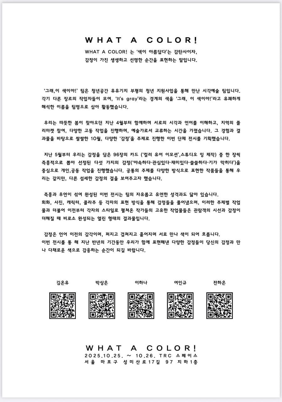 감정은 언어 이전의 감각이며, 퍼지고 겹쳐지고 흩어지며 서로 만나 색이 되어 흐릅니다. 이번 전시를 통 해 지난 반년의 기간동안 우리가 함께 표현해낸 다양한 감정들이 당신의 감정과 만나 다채로운 색으로 감응하는 순간이 되길 바랍니다.