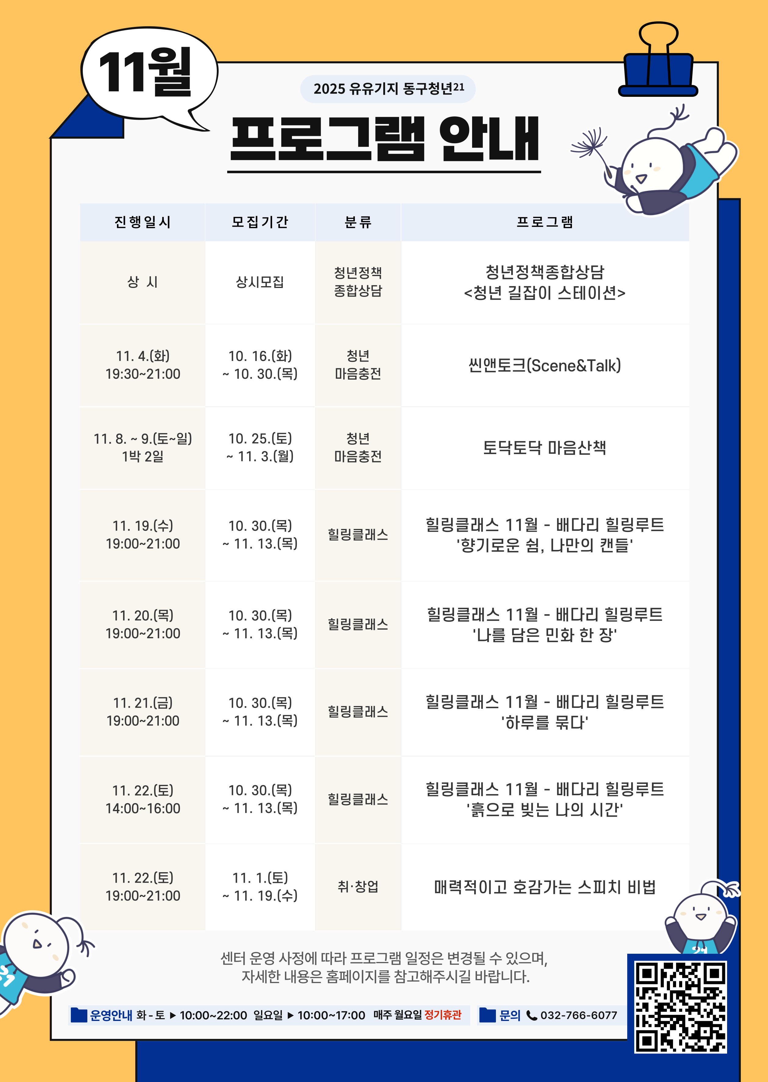 - 청년 정책, 연계기관 연결 등 1:1상담을 통해 도움이 되어드립니다!
