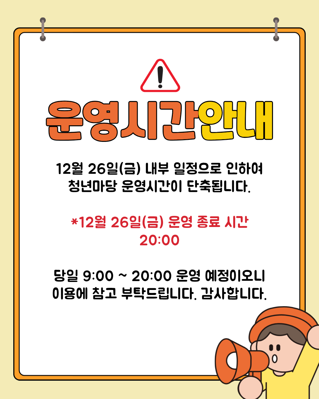 12월 26일(금) 내부 일정으로 인하여 청년마당 운영시간이 단축됩니다. * 12월 26일(금) 운영 종료 시간 - 20:00 당일 9:00 ~ 20:00 운영 예정이오니 이용에 참고 부탁드립니다. 감사합니다.