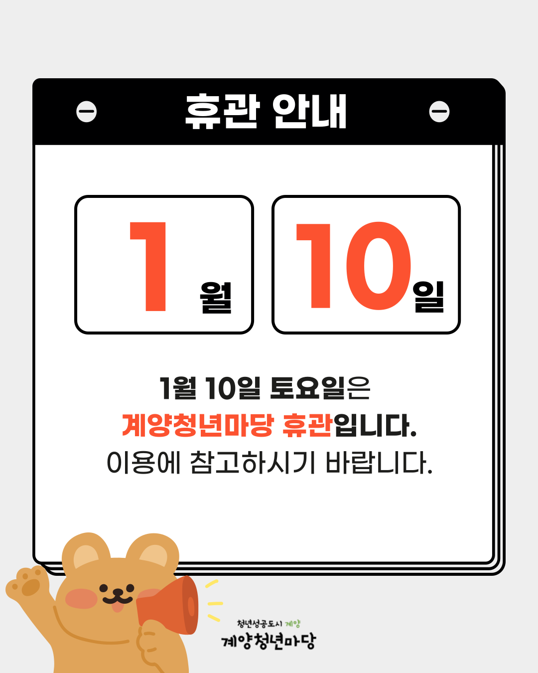 [1월 10일 휴관안내] 안녕하세요. 계양청년마당입니다. 계양청년마당은 ✅1월 10일(토)✅ 휴관입니다. 방문 시 일정을 미리 확인하여 주시기 바랍니다. 감사합니다. 📞문의처 : 032-450-8356