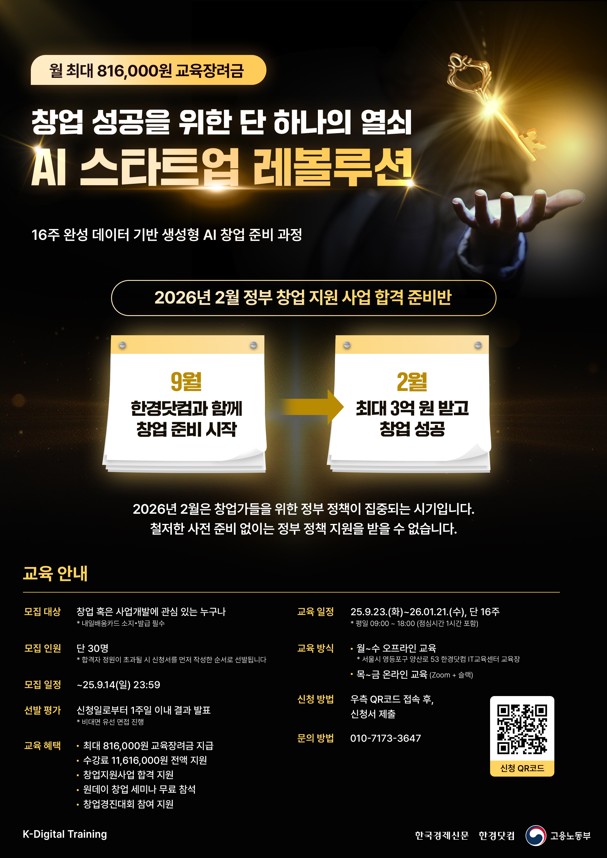 📢고용노동부와 한경닷컴이 청년창업가 양성을 목표로 [AI 스타트업 레볼루션] 창업 교육을 조성했습니다.