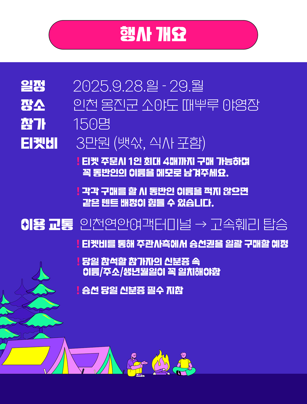1인당 3만 원(3~4인 텐트 숙박, 식사 3식, 왕복 승선권 포함)