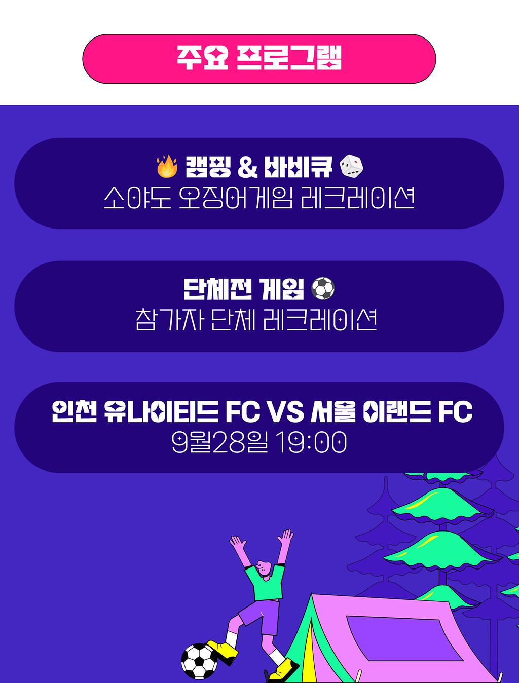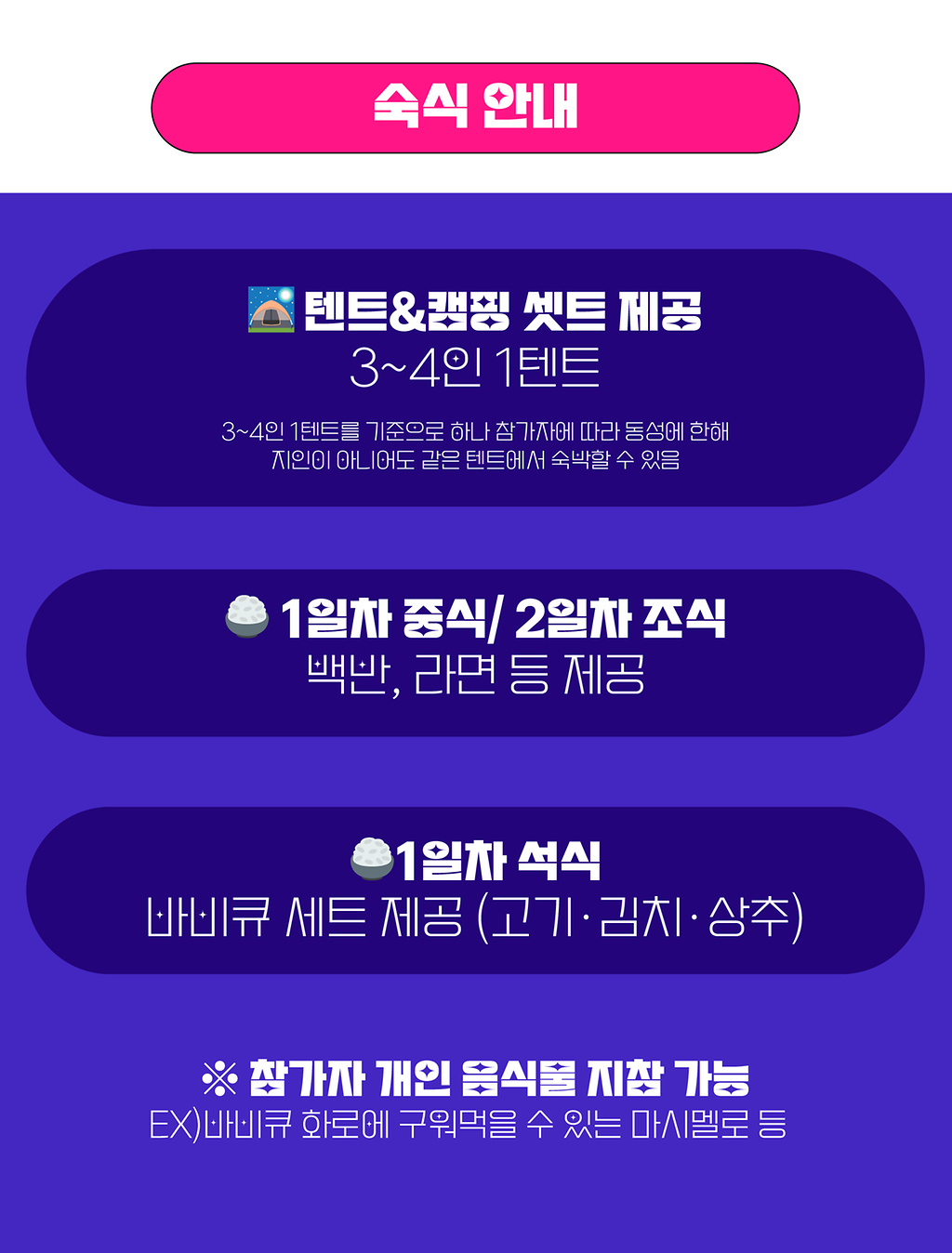 * 동성 참가자에 한하여 지인이 아니어도 같은 텐트에서 숙박할 수 있어요