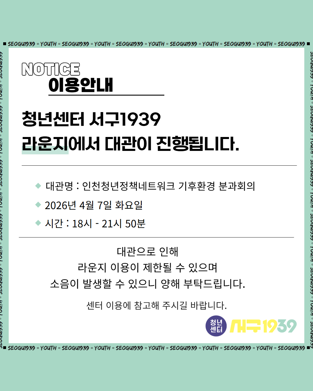 안녕하세요. 서일삼씨🌹 청년센터 서구1939 라운지에서 대관이 진행됩니다. 대관명 : 기후환경 분과회의 진행날짜 : 4월 7일 화요일 18시 - 21시 50분 라운지 대관 진행으로 인해 이용객분들의 자유로운 이용이 어려울 수 있습니다. 문의 : 032-560-0939