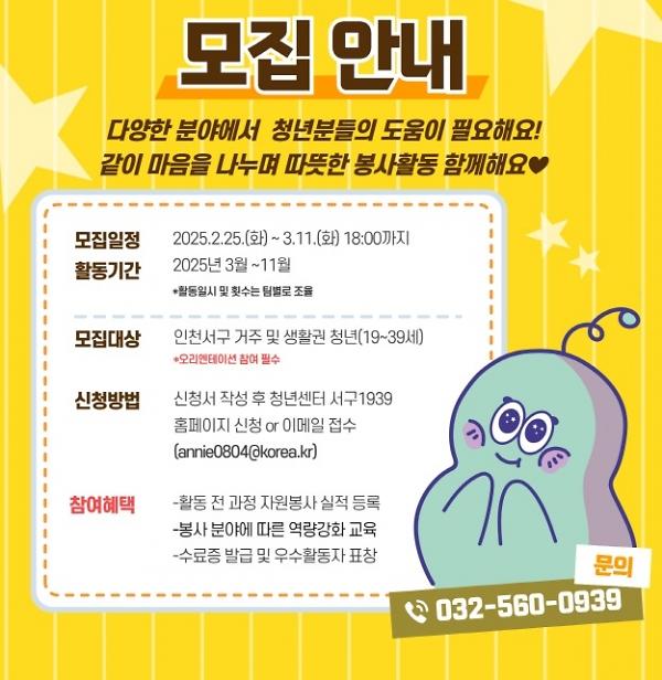 인천 서구가 청년들이 지역사회 봉사활동에 나설 수 있도록 ‘서일삼 봉사단’을 창단, 오는 3월11일까지 참여자를 모집한다고 한다.