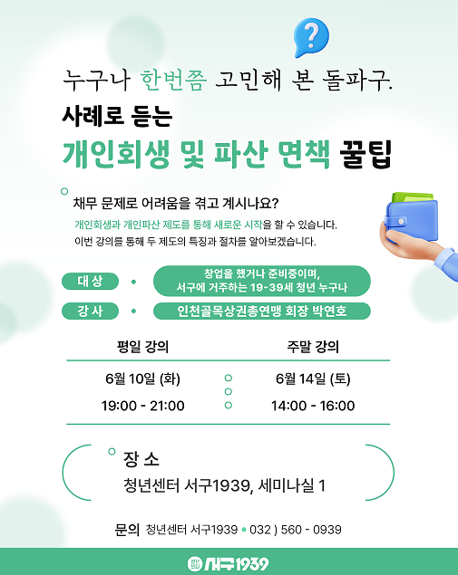 누구나 한 번쯤 고민해 본 ‘개인회생과 파산 면책’을 주제로 청년센터 서구1939에서 특강을 진행한다고 하였다.